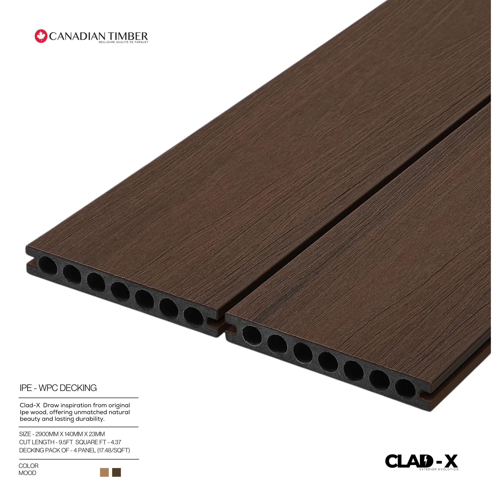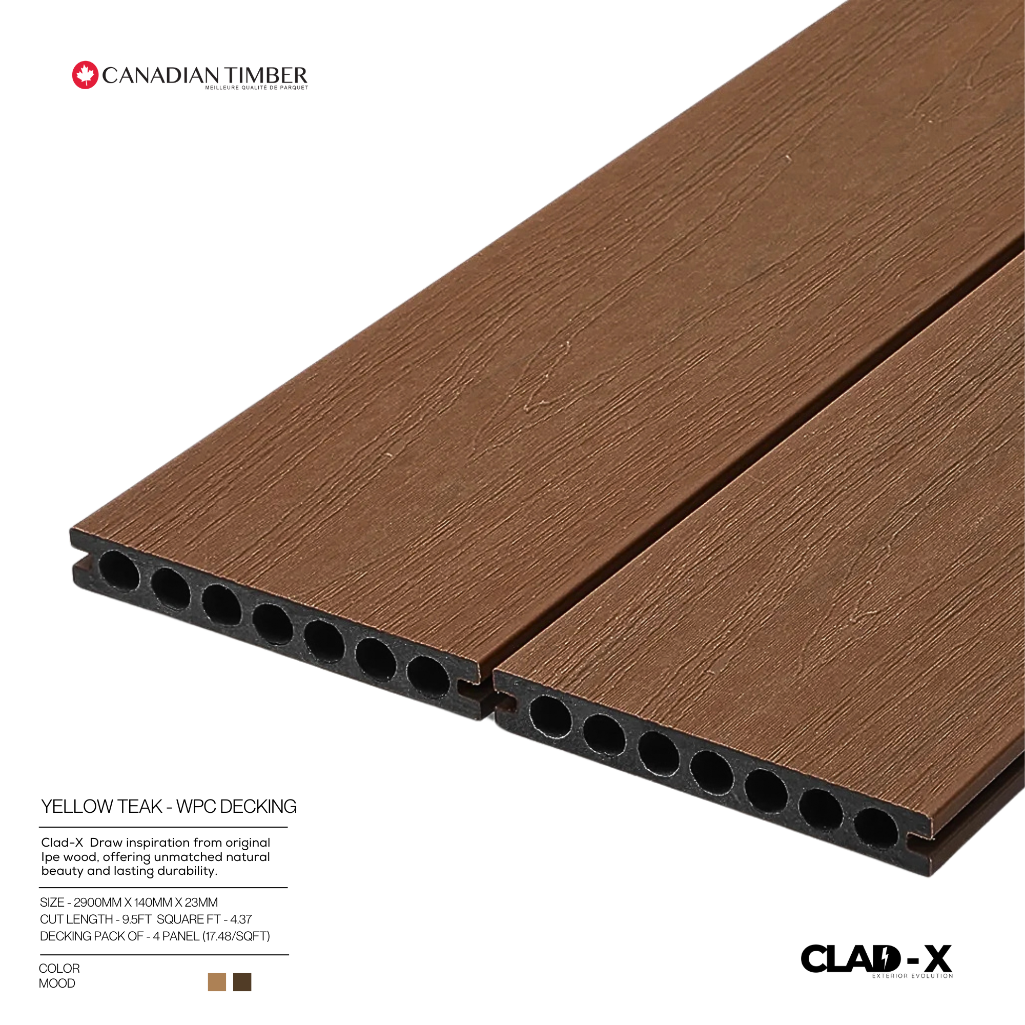 The Clad-X WPC Decking by Canadian Timber offers the perfect balance of natural aesthetics and modern performance. Designed to capture the beauty of real wood, it combines elegance with unmatched durability. Resistant to weather, UV rays, and termites, this decking ensures long-lasting performance with minimal maintenance. Its anti-slip surface enhances safety, making it ideal for outdoor spaces like patios, pool areas, and walkways. Eco-friendly and sustainable, the Clad-X series is crafted from high-quality wood-polymer composites, providing a premium, nature-inspired solution for both residential and commercial projects.